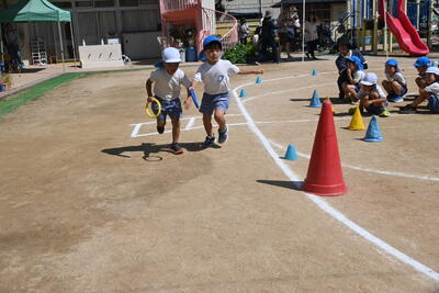 リレーに向かう年長組の後ろ姿!気持ちが入っていますね。