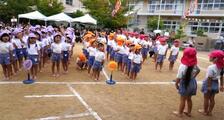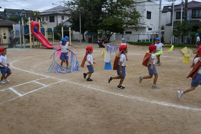さんさんびろばのお友達が運動会で楽しんだ遊びをうめ組とばら組が・・・・。茶色いマントが似合っています!